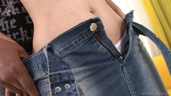 Blonde teen Kinzy Jo undressing and a guy licks and touches her body
